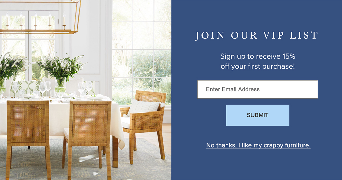 Continue ReadingI’ve been shopping online. Unsurprisingly, a parade of website pop-ups asked for my email address. I was 80% annoyed, 20% amused by the ones that gave an ultimatum: fork over your email address or admit that you.